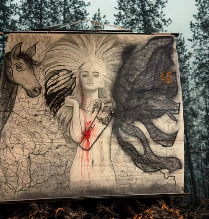 Dieses ausdrucksstarke Kunstwerk vereint Stärke, Verletzlichkeit und Mystik in einer einzigen Szene. Eine weibliche Figur steht im Zentrum – stolz, ruhig und zugleich tief berührt. An ihrer Seite erscheinen ein Pferd als Symbol für Freiheit und ein dunkler, fließender Schatten, der wie ein Flügel ihre Silhouette umrahmt. Feine Linien und kräftige Strukturen treffen auf subtile Rottöne, die Emotion und Leben in das Werk tragen.